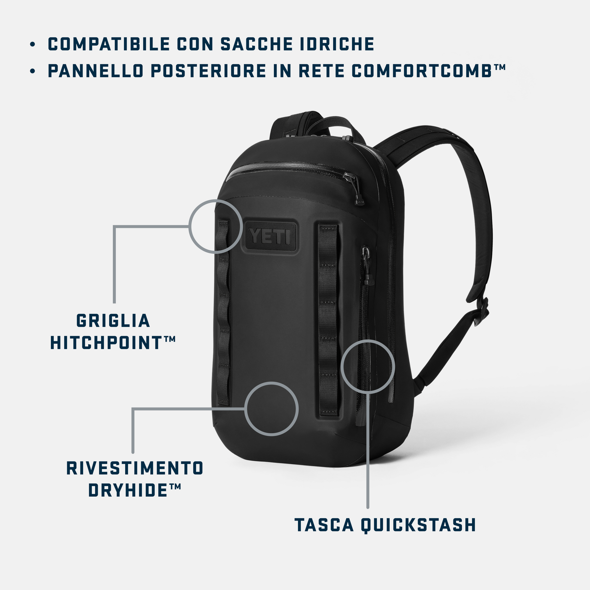 Nota bene: lo zaino Cayo™ è realizzato con materiali resistenti all'acqua ma non è impermeabile. In determinate circostanze e condizioni meteorologiche, il contenuto dello zaino potrebbe bagnarsi.